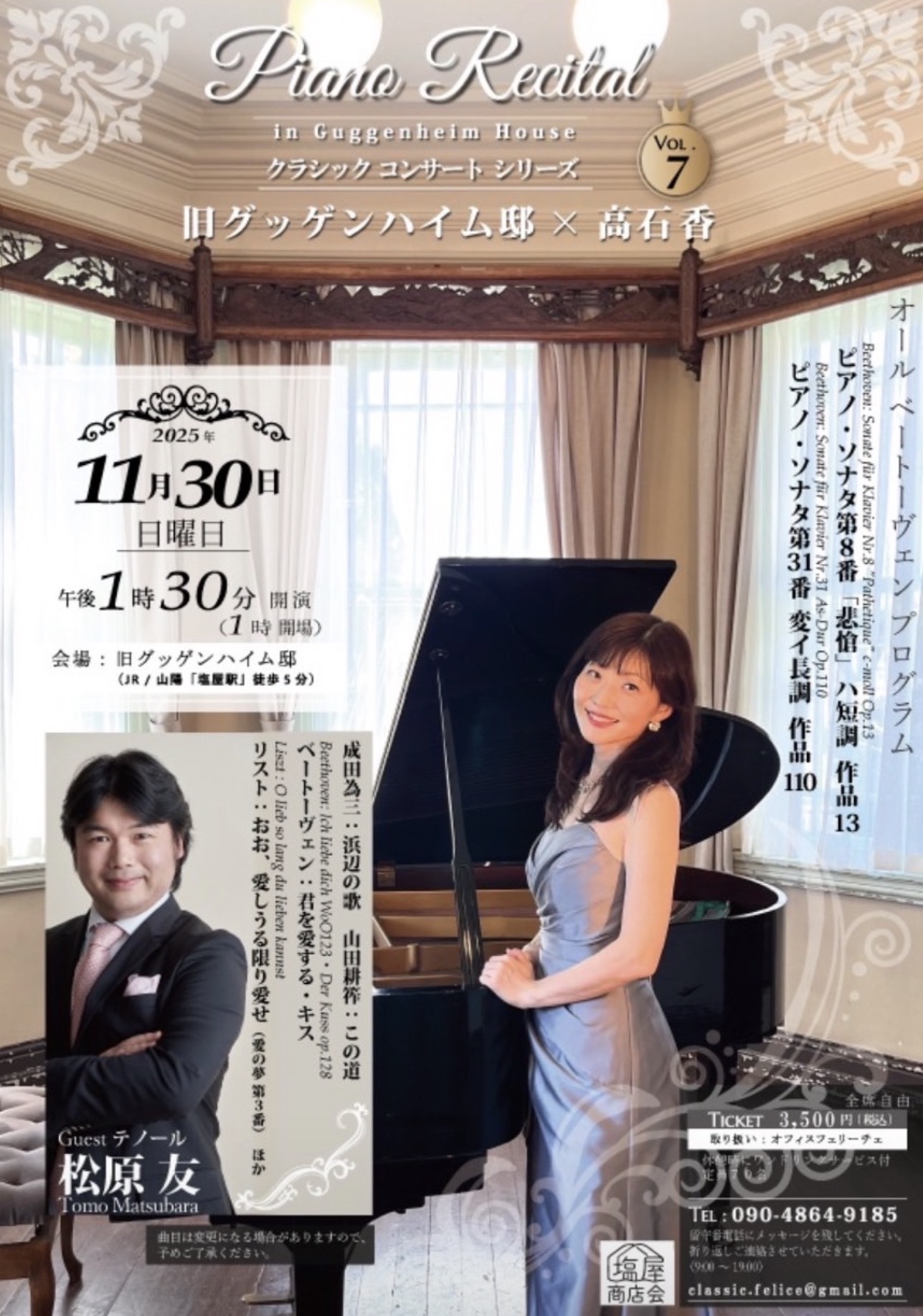 クラシックコンサートシリーズ第7回は、テノールの松原友さんをゲストにお迎えします。安定した実力で歌曲からオペラまでを歌い上げ、その麗しき歌声は多くの聴衆を魅了しています。今回、旧グッゲンハイム邸では日本歌曲もお届けいたします。どうぞお楽しみに。